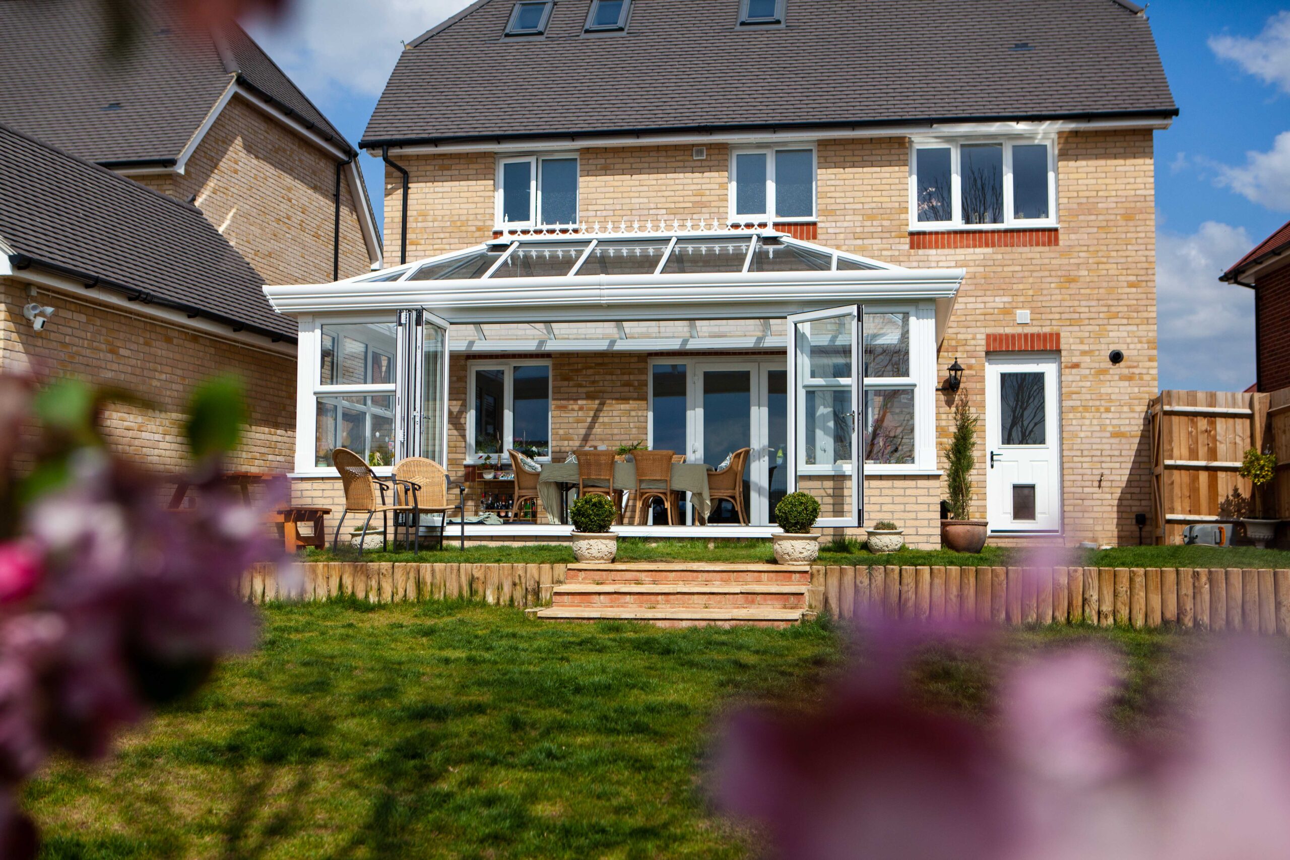 Mr and Mrs Daffin instructed ConservatoryLand to create the perfect Hipped-Back Edwardian Orangery for their Kent home. They designed every element of their made-to-measure Orangery from the base to the roof. They chose a Rustic Charcoal 697 brick skirt with the traditional white uPVC frame, creating a stylish modern exterior. They paired this with our Blue Self-Cleaning, Solar Control Glass for the Orangery’s roof, and bi-fold doors that open the home into the garden. They appreciate the easy access it gives them to their garden, making dining al fresco a regular part of their lives.