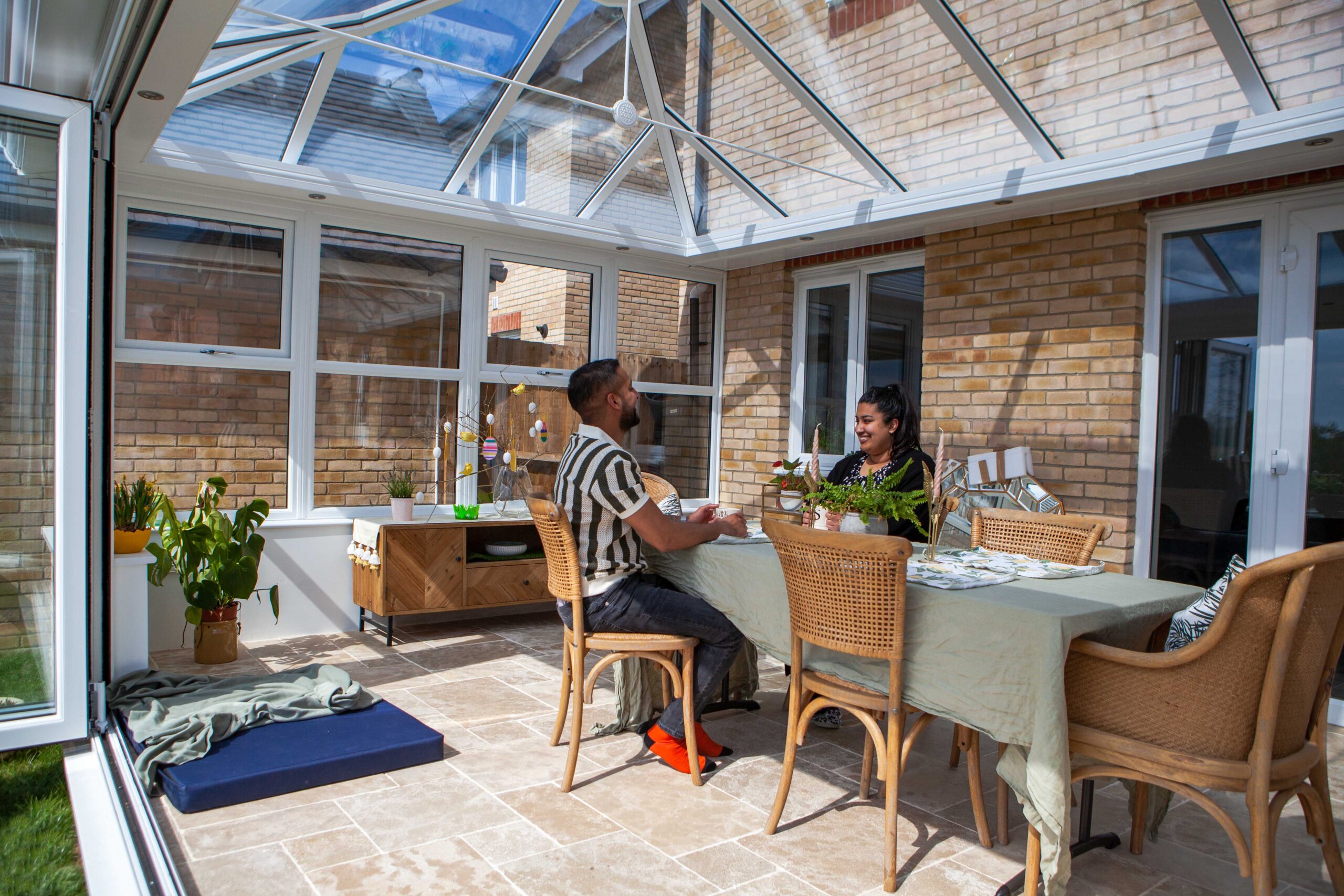 Essex couple Mr and Mrs Patel also chose a Hipped-Back Edwardian Orangery. To blend in with their home’s exterior, they picked the Rustic Cream colourway for the ConservaBase’s brick skirt. This is almost an exact match with the couple’s existing brickwork and helps the Orangery look like it was always meant to be there.