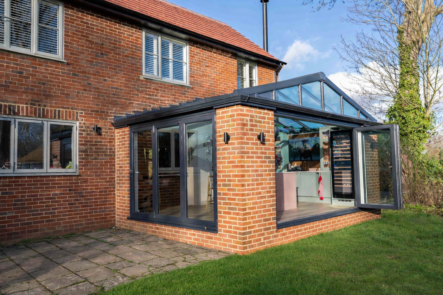 The anthracite grey exterior gives the conservatory a modern appearance, while the white interior keeps the space feeling light and inviting. The result is a room that blends seamlessly with the existing home.