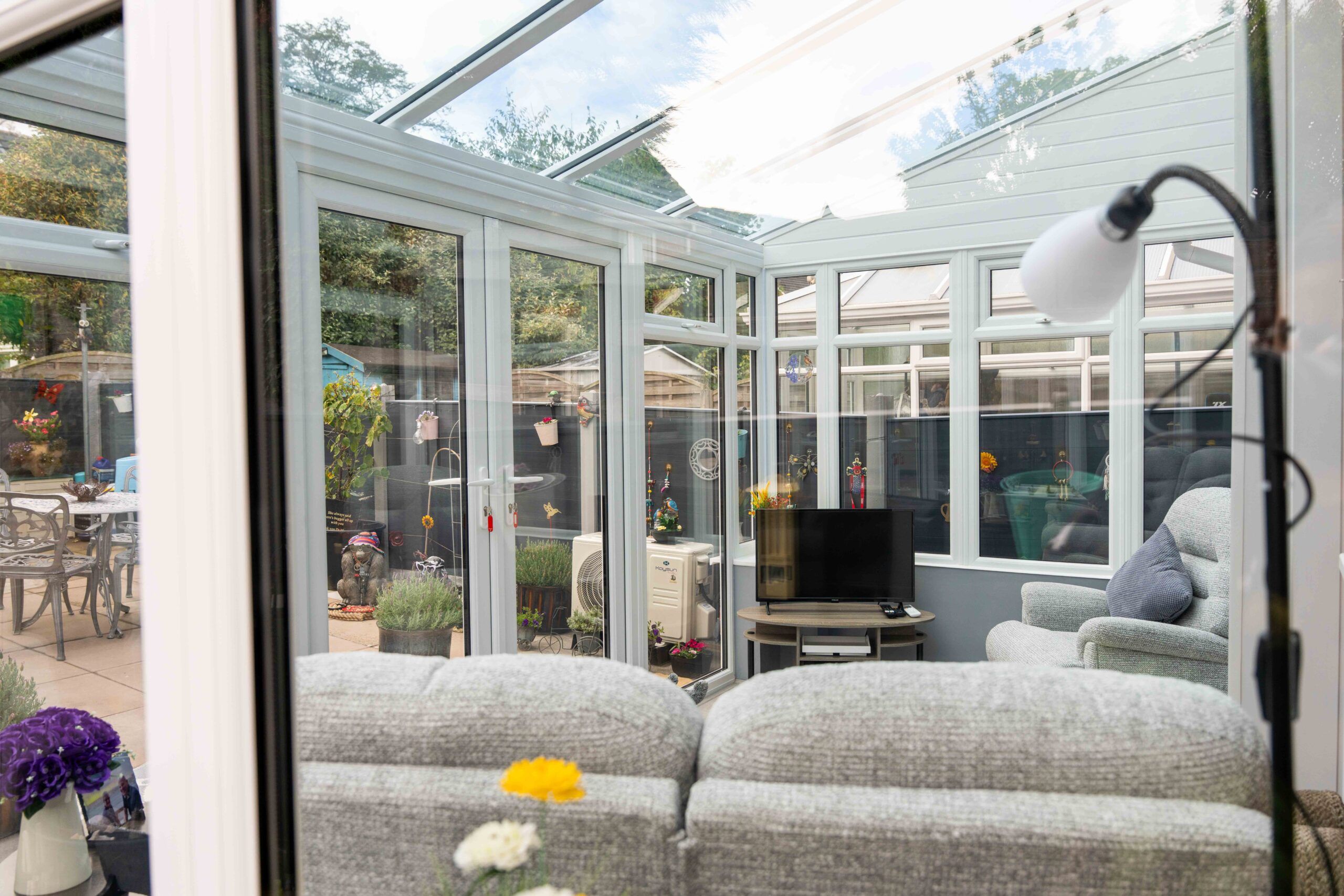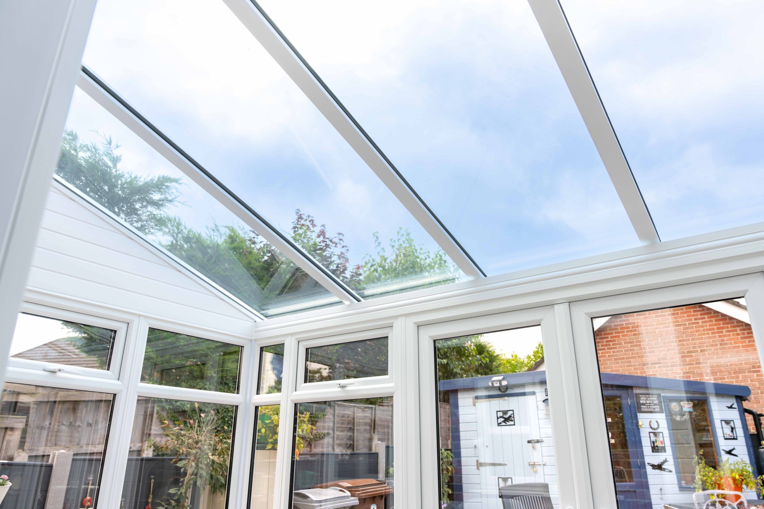 Colour White PVCu, 24mm Blue Self Cleaning, Solar Control Glass for the roof, Chrome handles